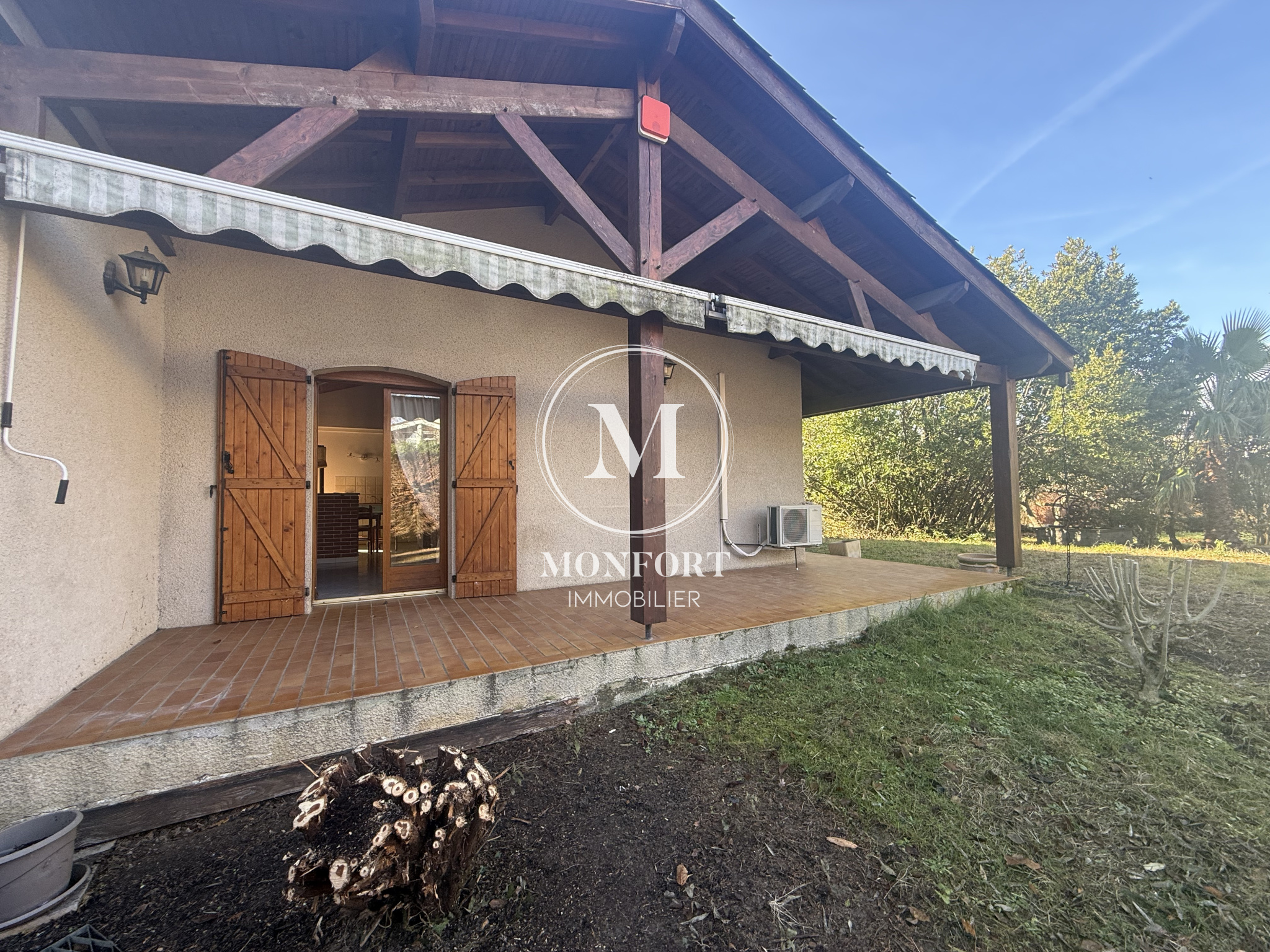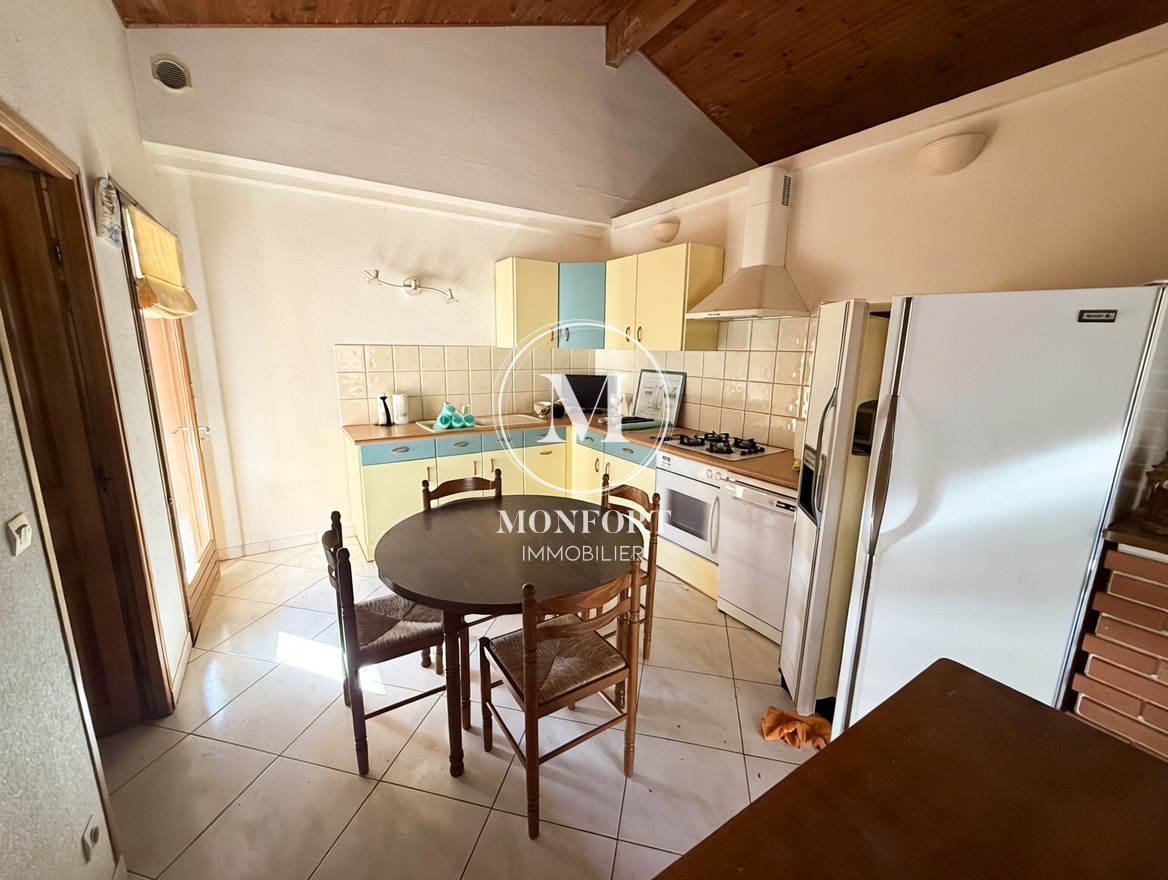 Elle offre une grande pièce à vivre déplafonnée de 50 m2 avec cheminée et cuisine ouverte, donnant sur deux terrasses agréables et sans vis-à-vis