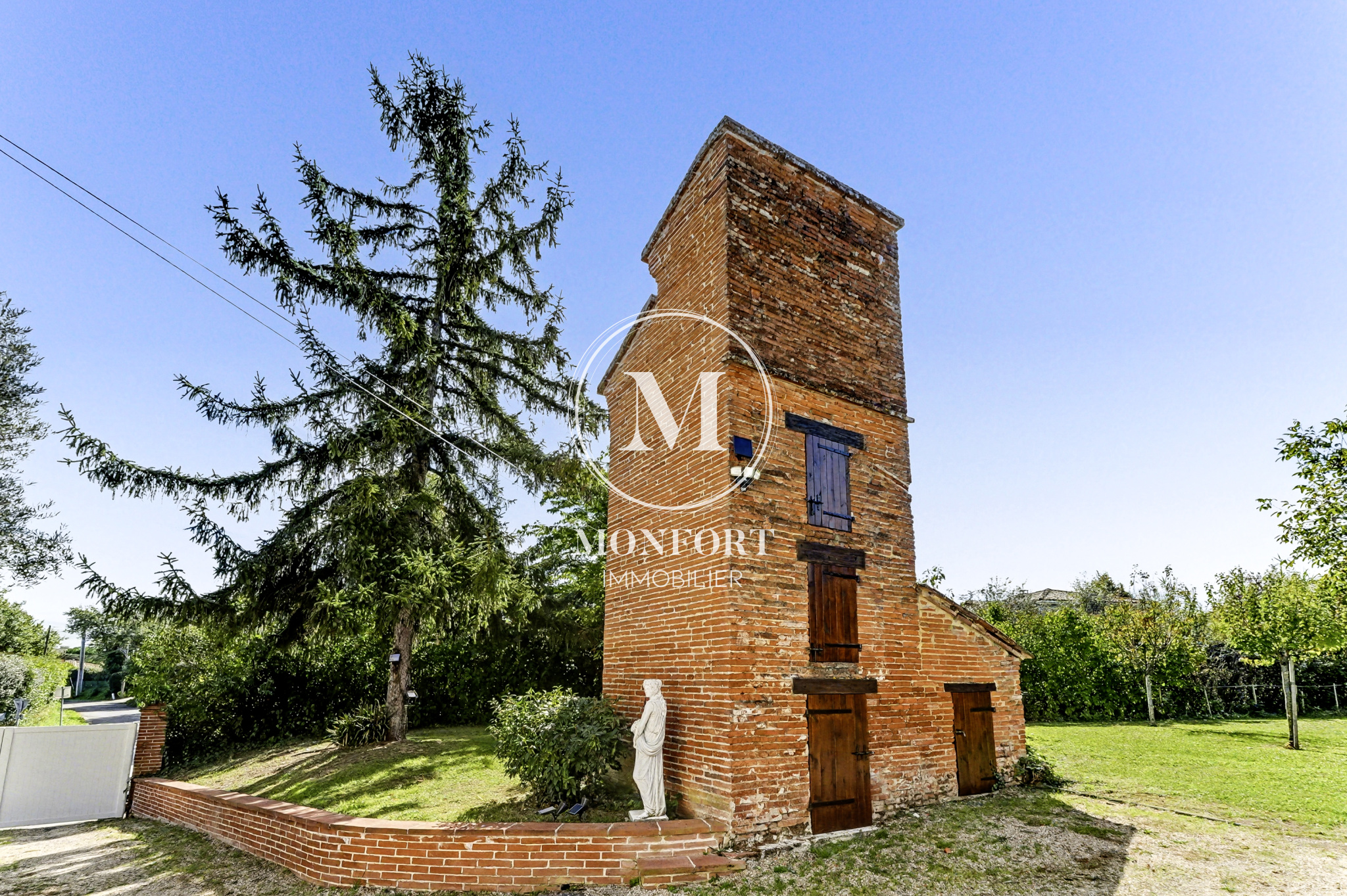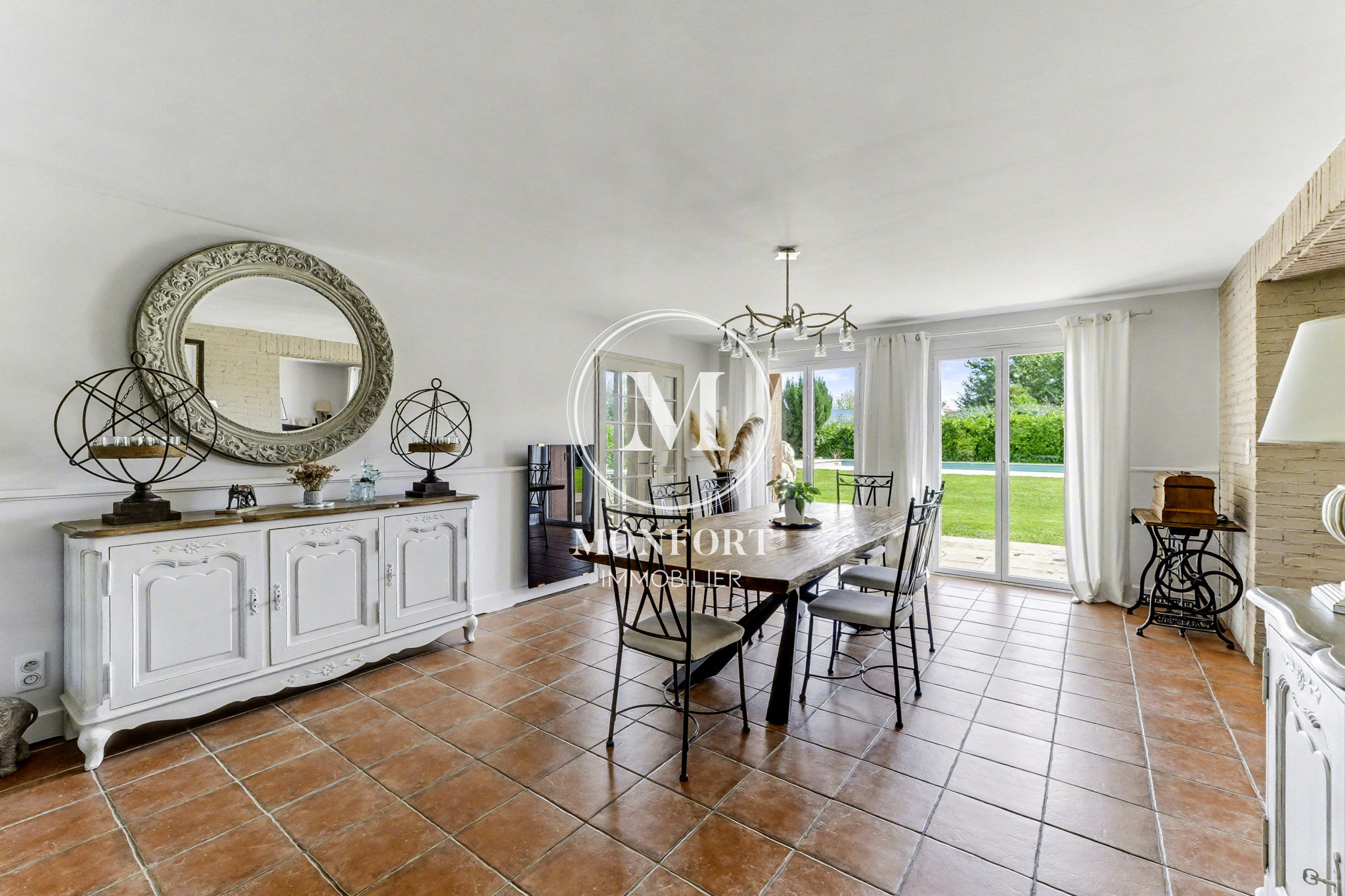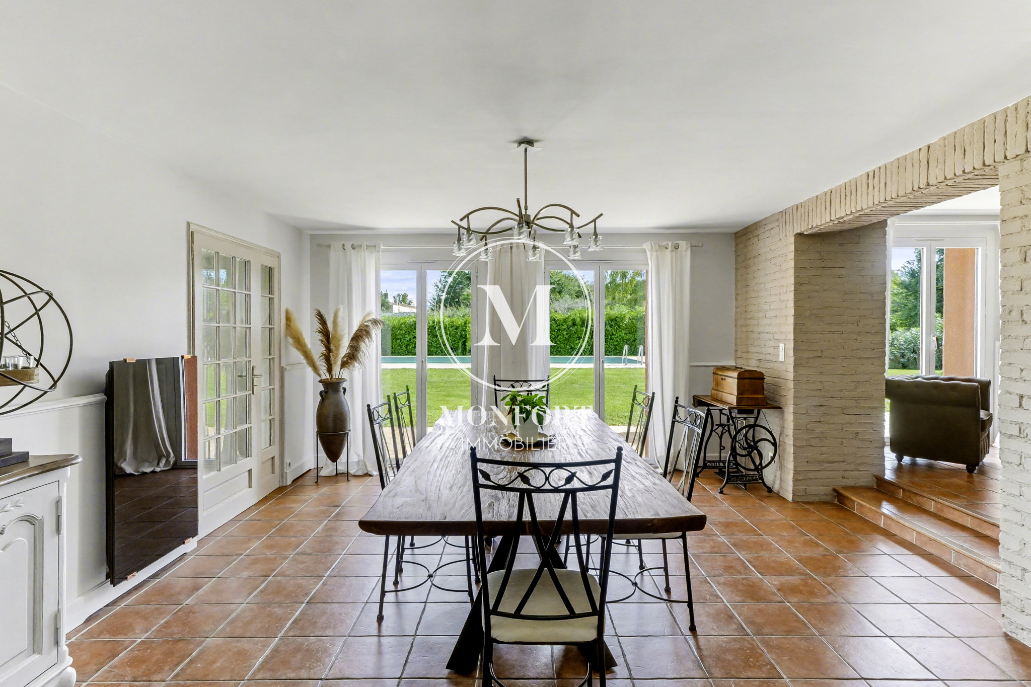 À l’extérieur, le charme opère immédiatement. Le terrain, sans vis-à-vis, propose plusieurs ambiances, dont un espace verger, et accueille une très belle piscine de 12 x 5,5 m entourée d’une élégante terrasse en travertin. Le pigeonnier, véritable signature de la maison, apporte une touche d’authenticité supplémentaire.