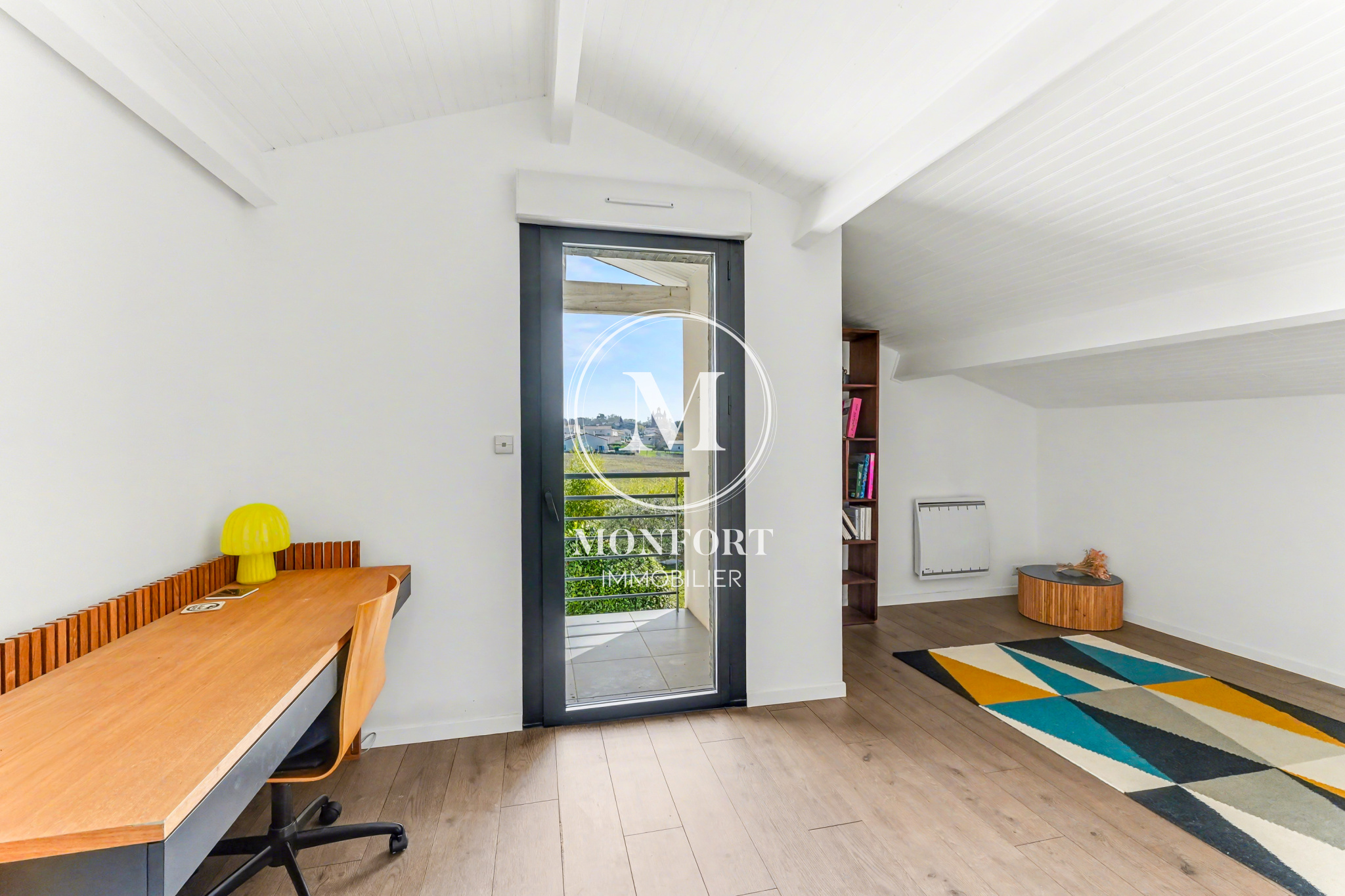 À l’étage, un espace lecture et un coin bureau viennent compléter trois chambres supplémentaires, ainsi qu’une salle de bain et un wc indépendant.