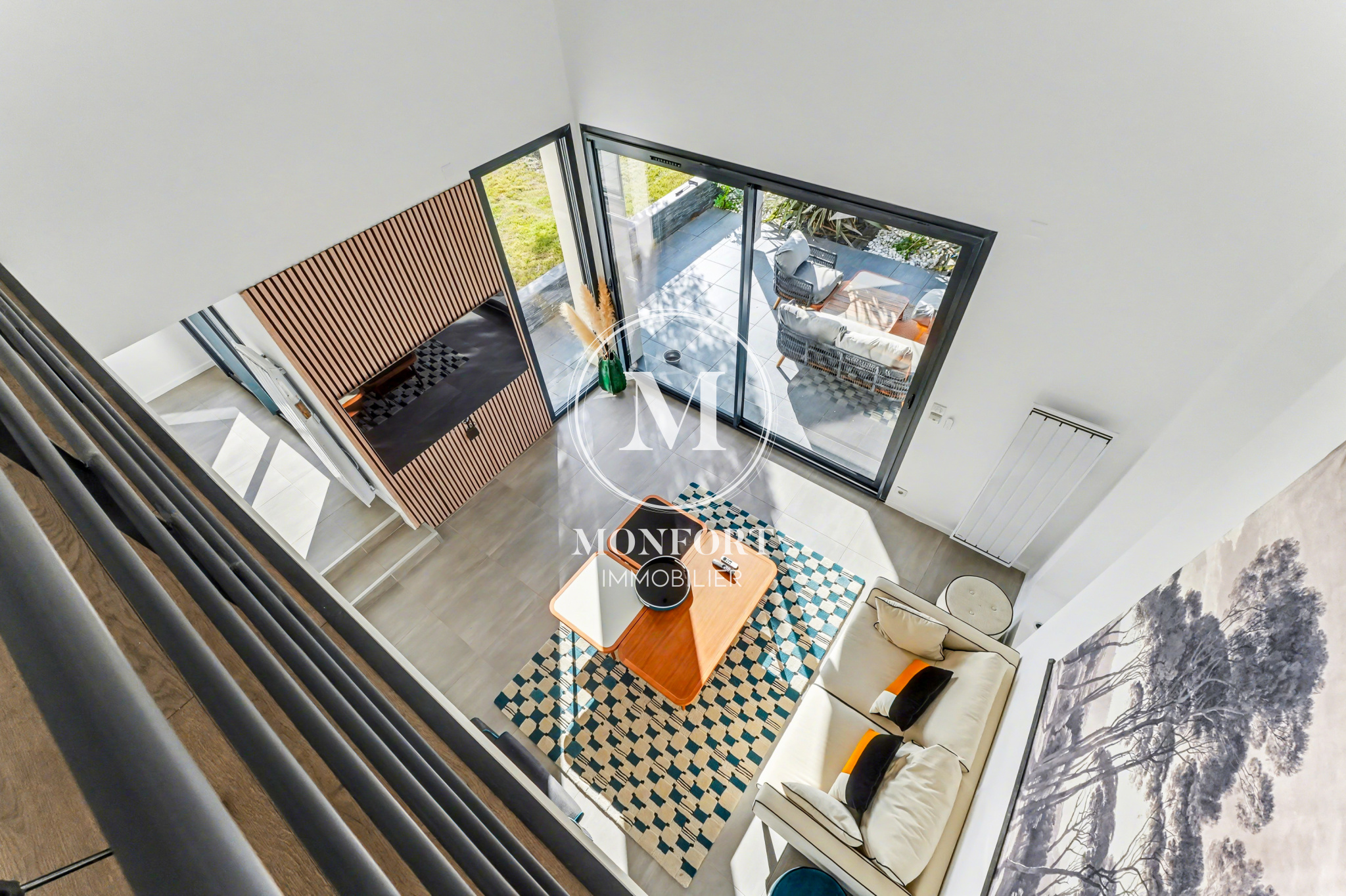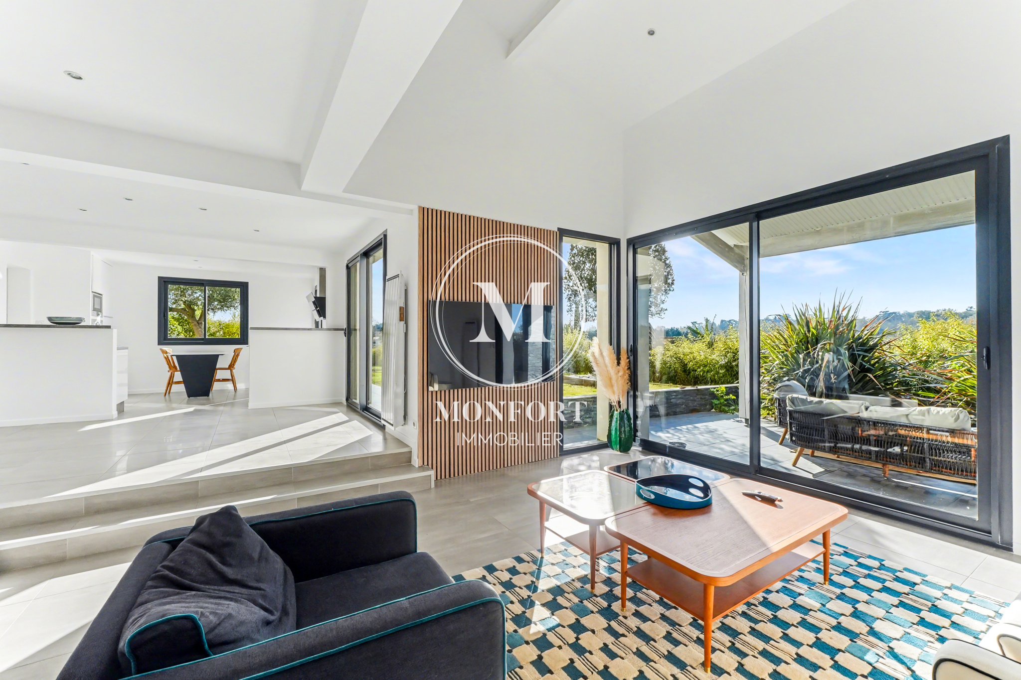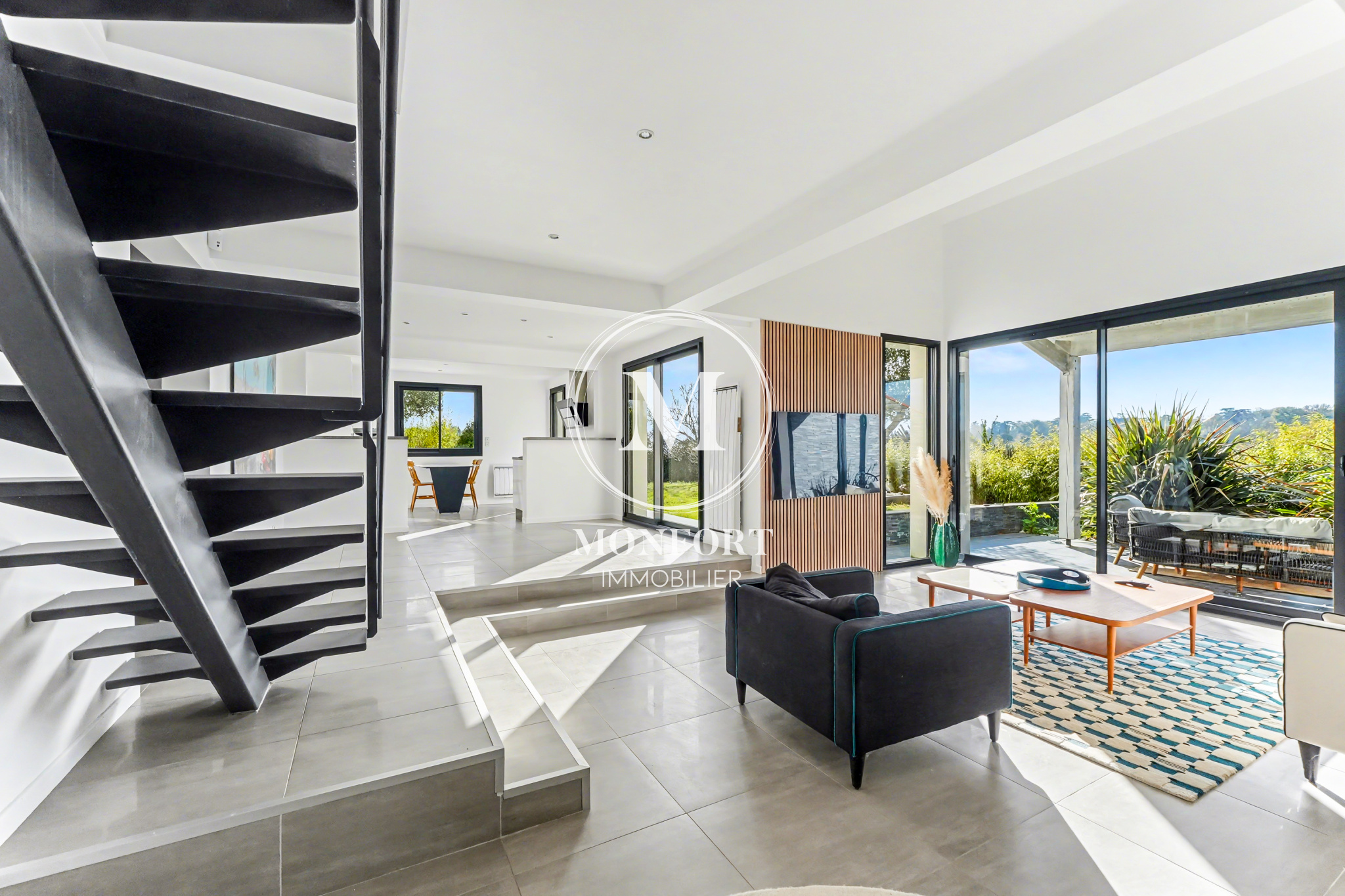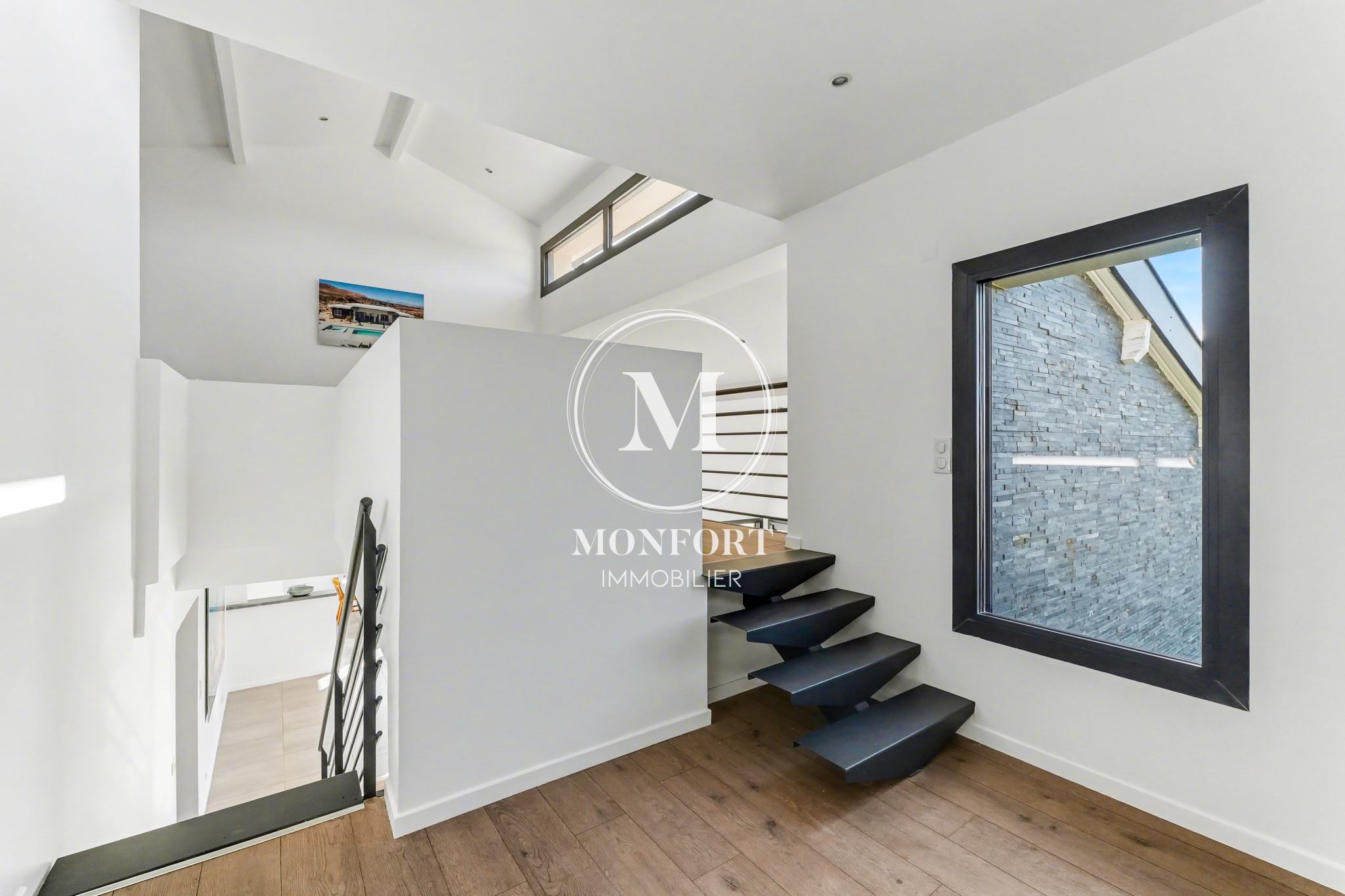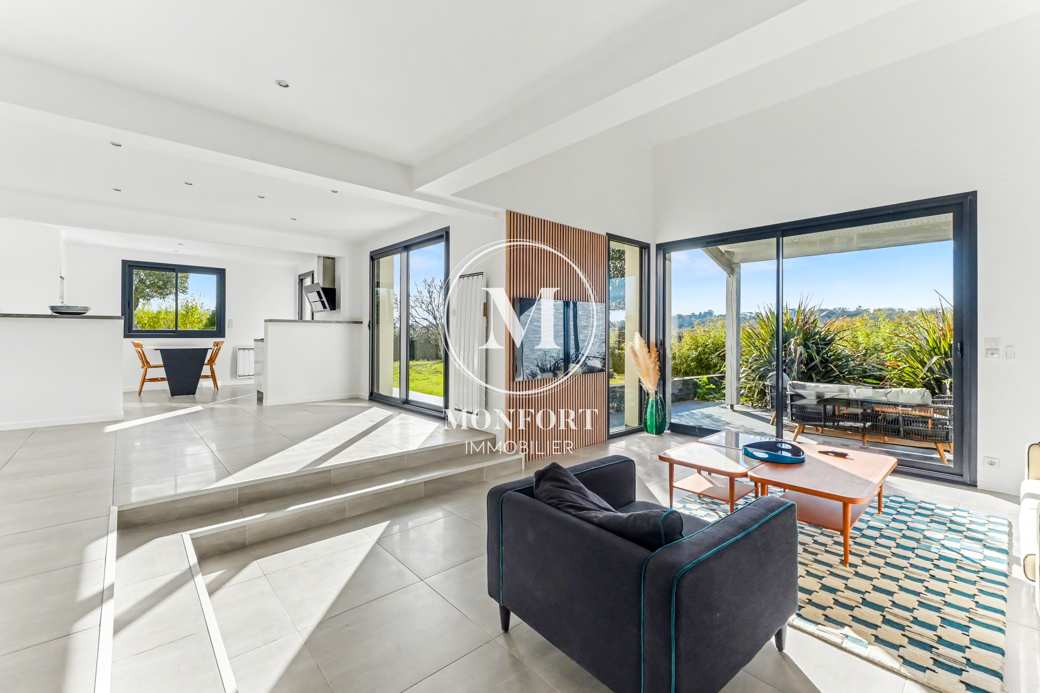 Le rez-de-chaussée se compose d’une grande entrée avec rangements, d’un bureau, d’un wc, et d’une superbe pièce de vie déplafonnée d’environ 65 m2 regroupant séjour, salle à manger et cuisine ouverte. L’ensemble bénéficie d’une luminosité exceptionnelle et donne accès à une terrasse couverte très agréable. Un cellier complète la partie jour.Le coin nuit du rez-de-chaussée dispose d’un large dégagement avec placard, de deux chambres et d’une salle d’eau.