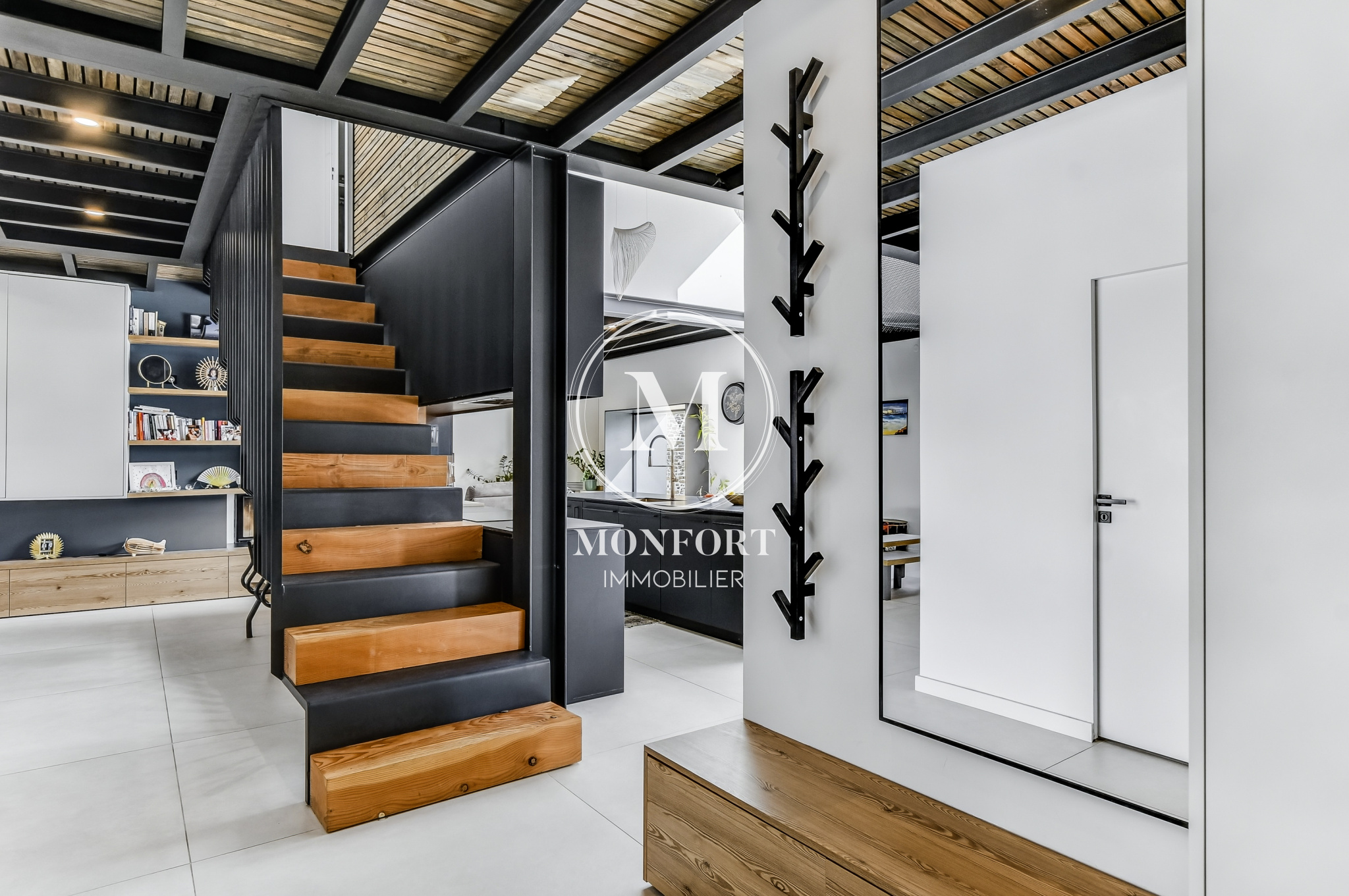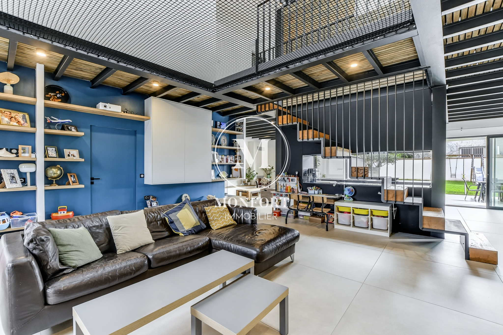 L’espace de vie principal, véritable coeur de la maison, s’étend sur près de 95 m2 autour d’un escalier central d’architecte. Il propose plusieurs ambiances distinctes : un salon chaleureux avec cheminée insert, un espace cinéma équipé d’un rétroprojecteur, un coin salle à manger, une cuisine ouverte haut de gamme avec îlot central.