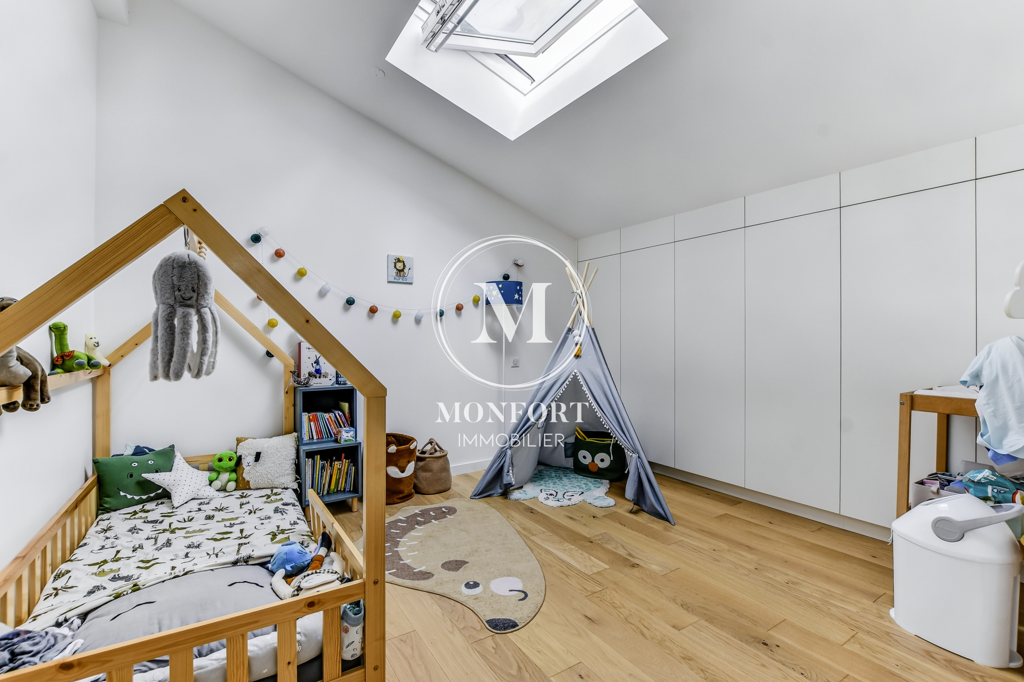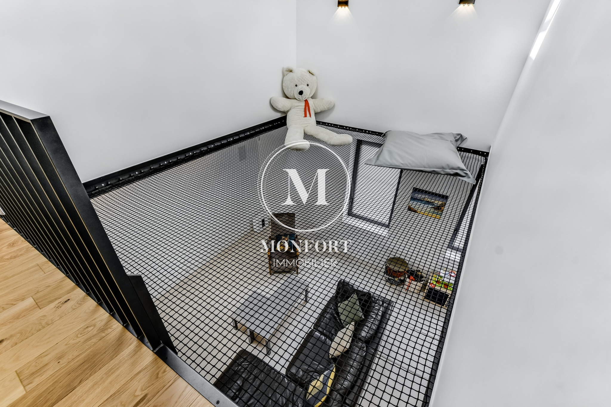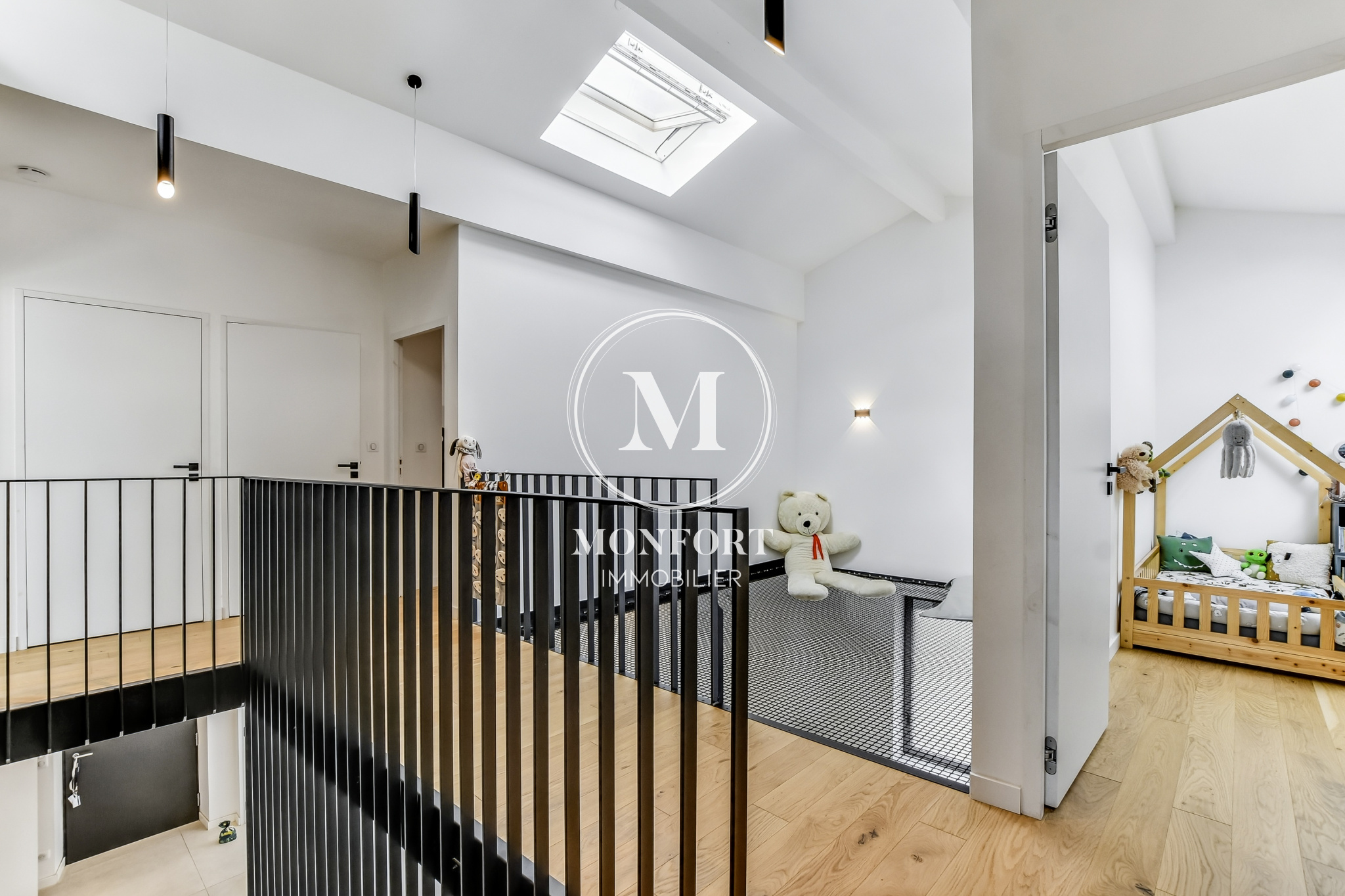 L’étage réserve de belles surprises : un dégagement baigné de lumière avec son espace cocooning suspendu en filet au-dessus du séjour, deux grandes chambres avec placards, une salle de bain, une suite parentale élégante avec dressing et salle d’eau, un bureau dominant la pièce à vivre et un wc indépendant.
