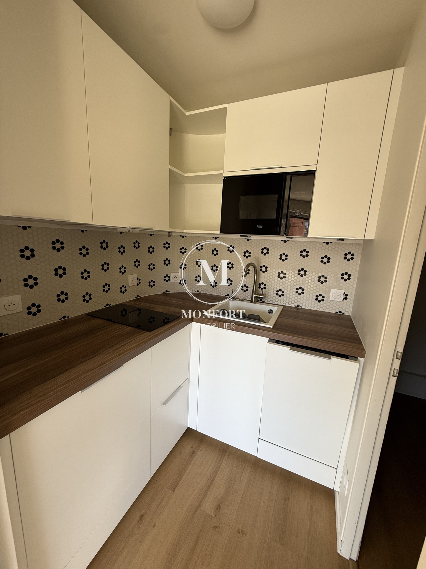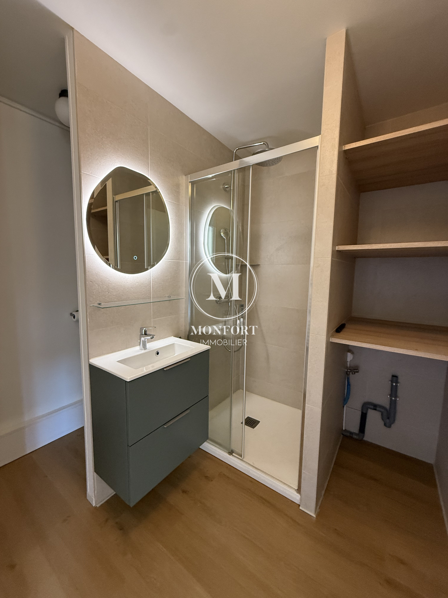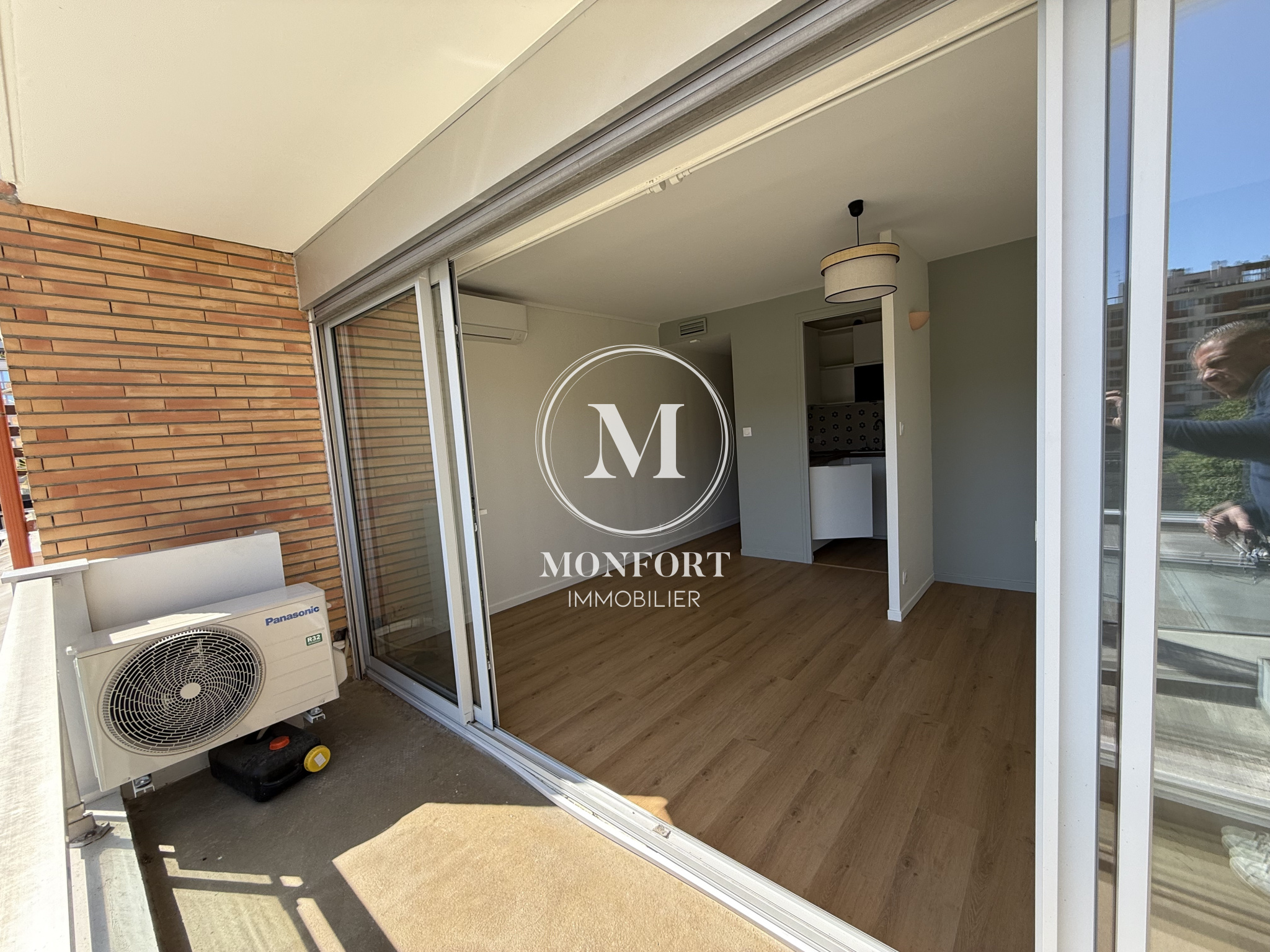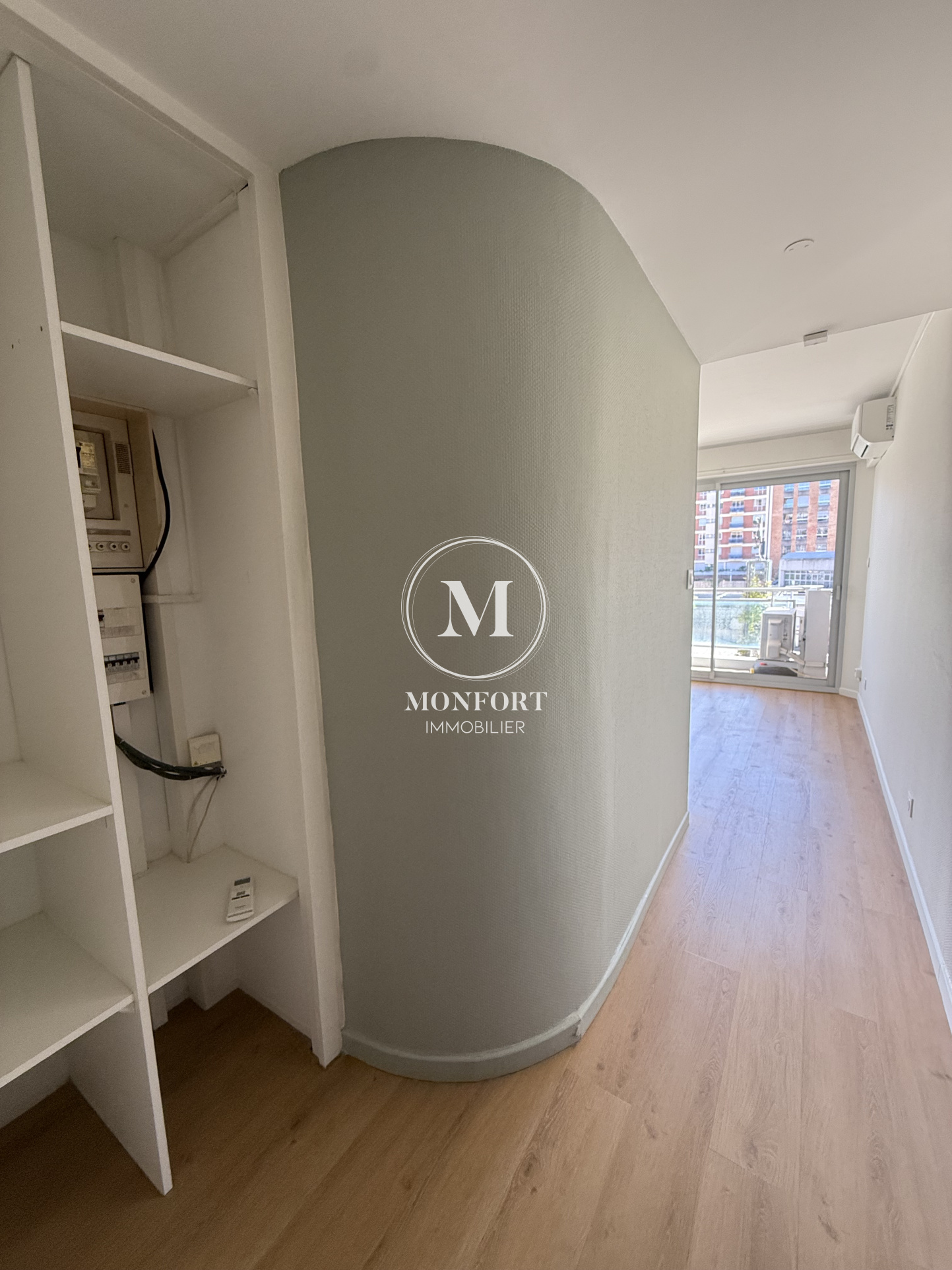 Situé au 2e étage avec ascenseur d’une résidence de standing, il se compose d’une entrée avec placard, d’un agréable séjour/chambre d’environ 20 m2 ouvrant sur un balcon de 4,68 m2, d’une cuisine équipée (plaque 2 feux, hotte, frigo top avec freezer, micro-ondes) et d’une belle salle d’eau avec un espace prévu pour une machine à laver.