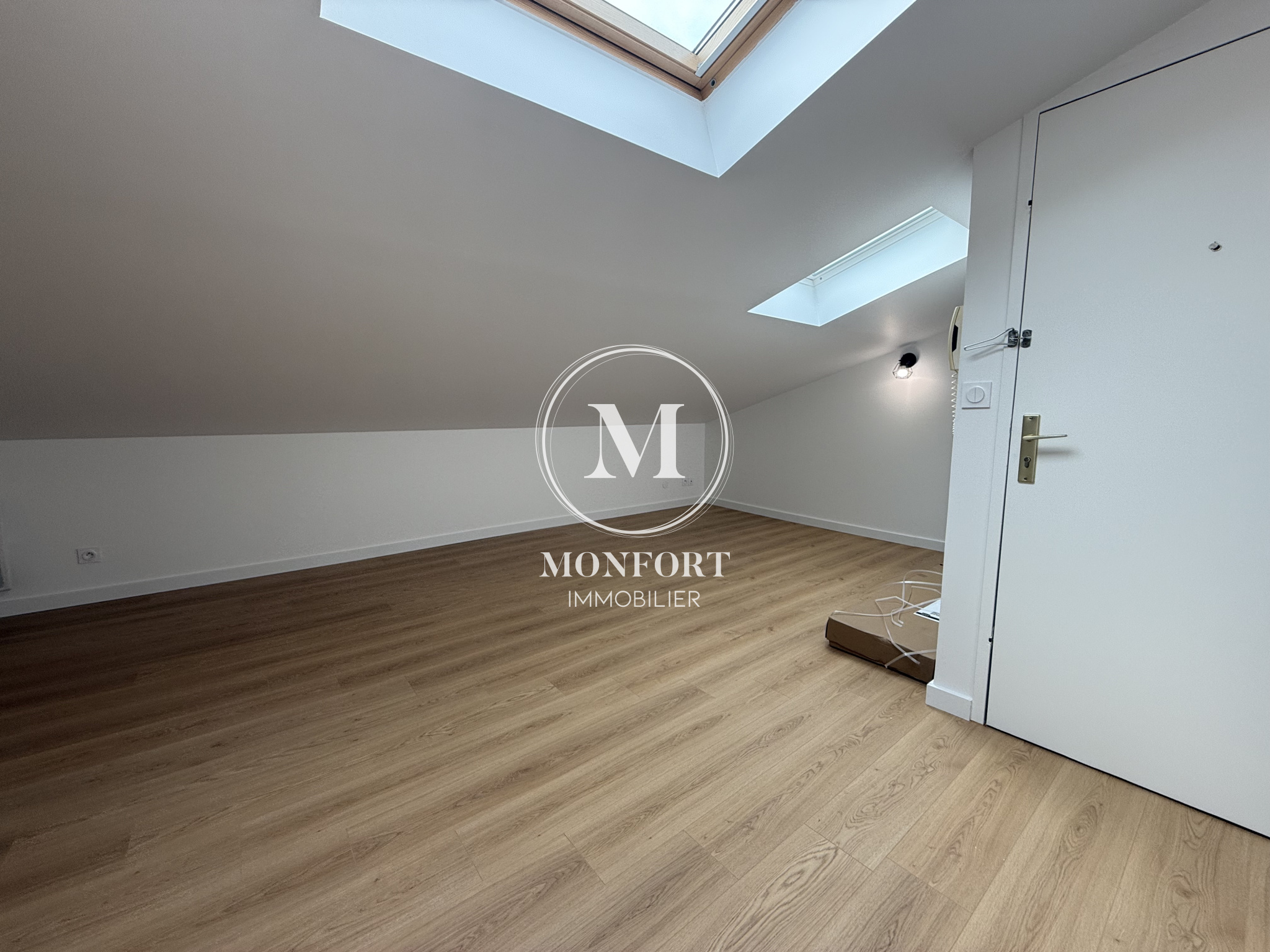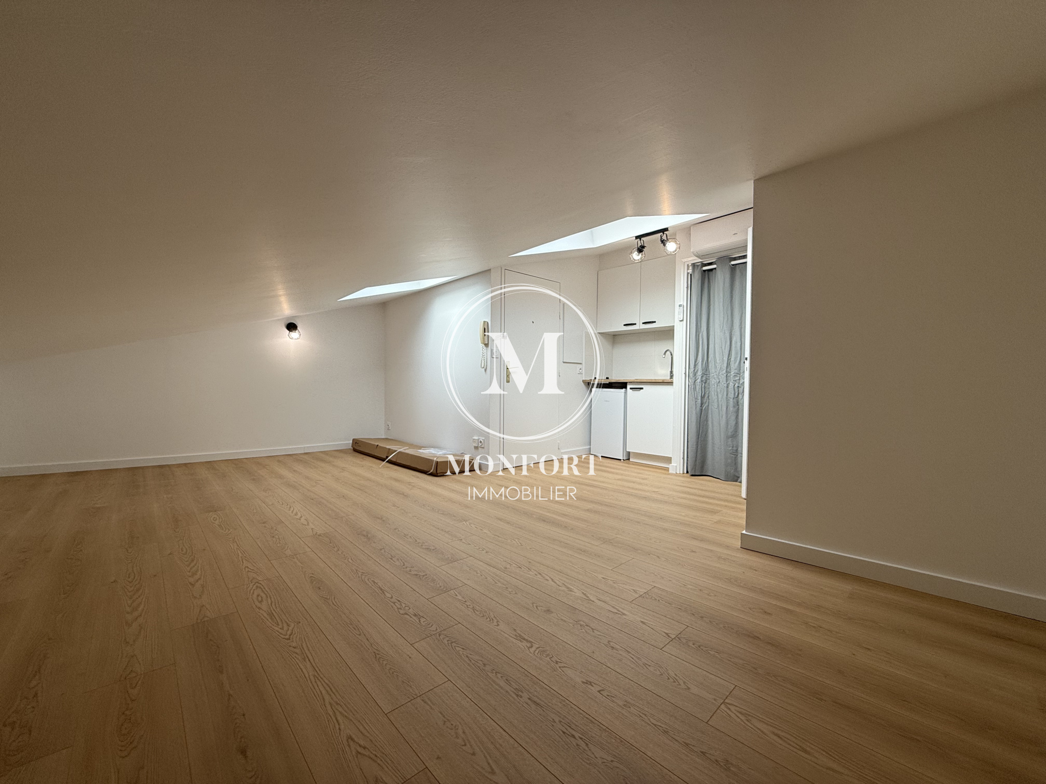 D’une surface de 12,3 m2 en loi Carrez, le studio offre une surface au sol de 28 m2. Il est composé d’une pièce à vivre avec kitchenette ouverte et équipée (réfrigérateur top, plaque de cuisson) et d’un placard astucieux permettant d’intégrer une machine à laver.